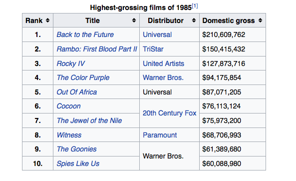 Speaking of the year's list of highest grossing films, Out Of Africa occupied position #5, right behind The Color Purple. A sprawling epic that carried us from early 20th century Denmark to the plains of Kenya, it was based on Karen Blixen's autobiography. This was the sixth out of seven times experienced director Sydney Pollack worked together with Robert Redford; their collaboration included classics like Jeremiah Johnson, The Way We Were and Three Days Of The Condor.